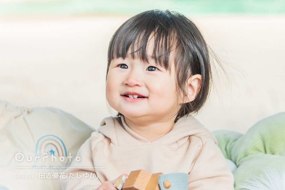 少し前に某スタジオで記念撮影をした際はうちの子が大泣きで親がどんなにあやしても駄目でほとんど泣き顔しか撮れなかったのですが、今回は自宅でリラックスできる雰囲気で撮ってくださってとても安心できました
