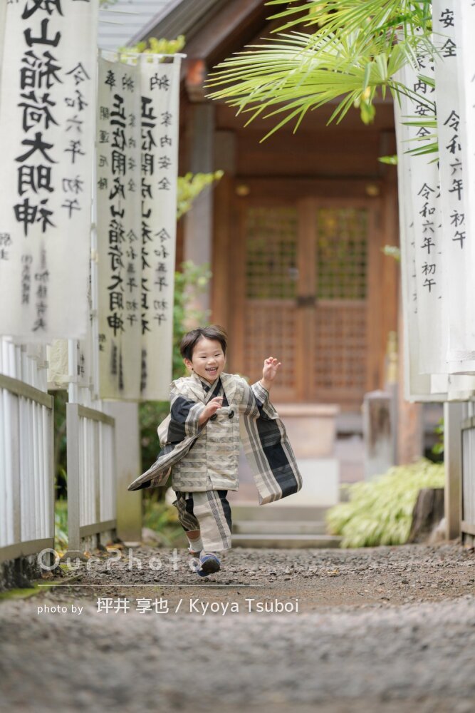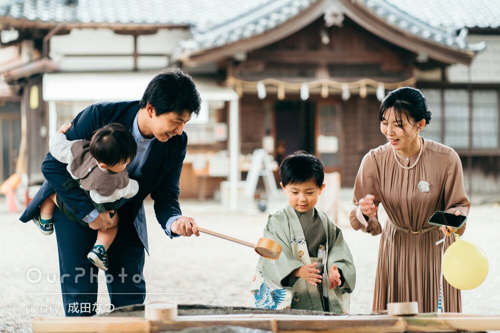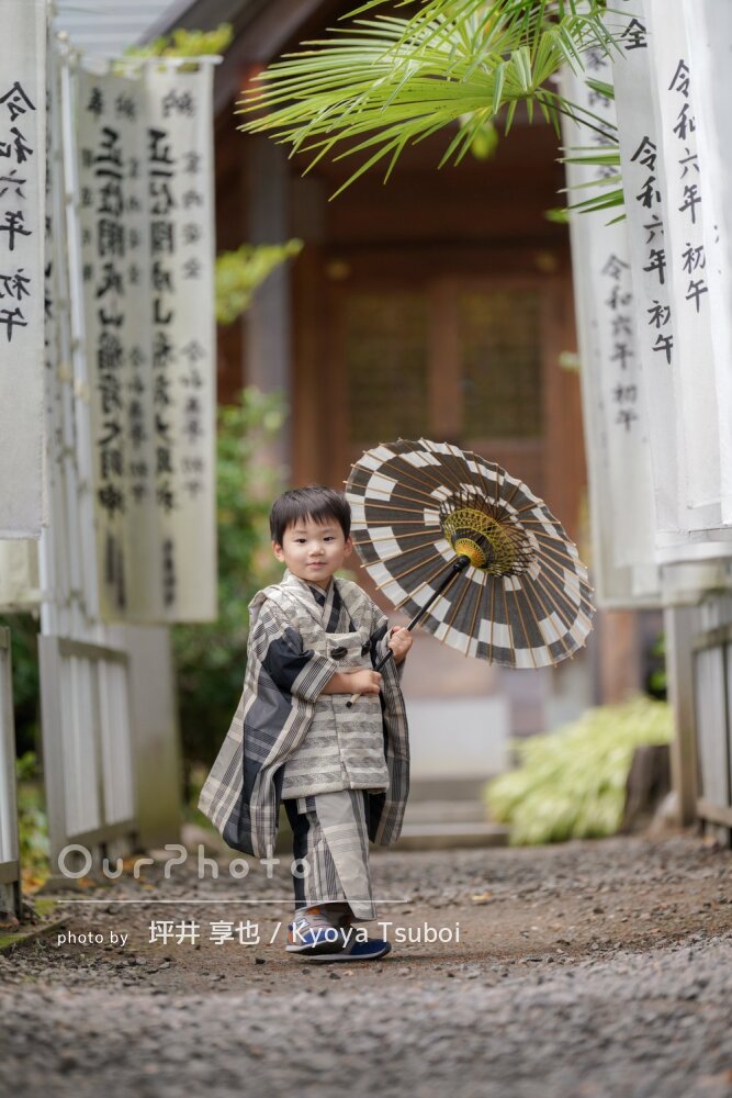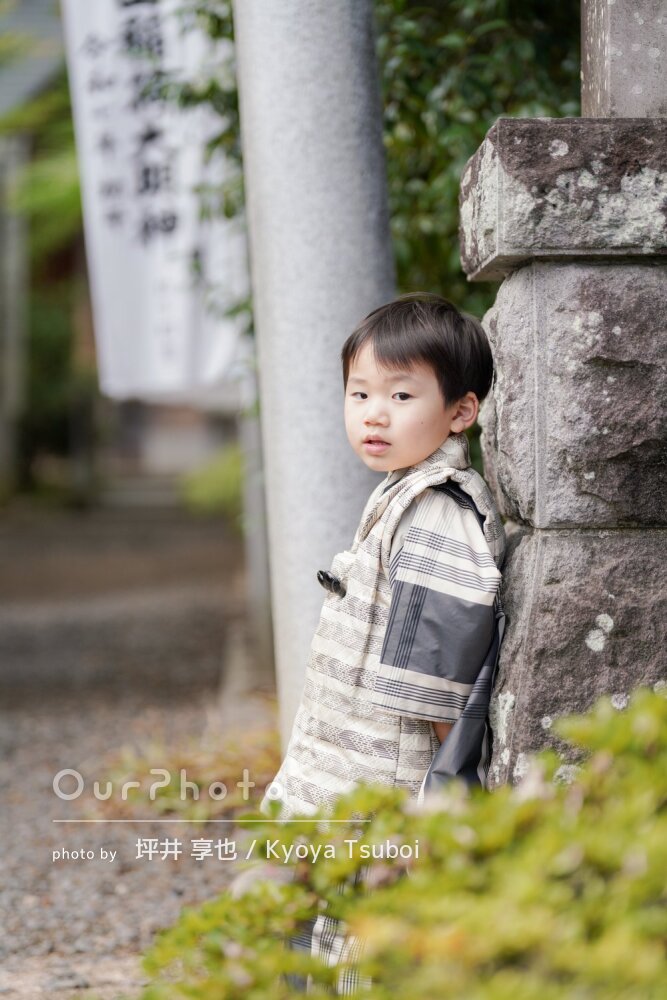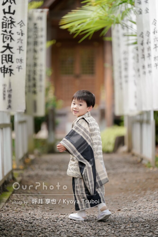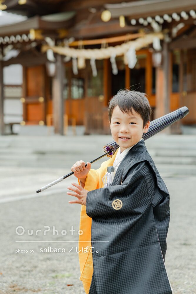 当日は、着物がきつくてご機嫌斜めな状態で神社に到着したのですが、到着後すぐにみーさんと会い、みーさんの声掛けで途端に元気にポーズを取り出しました。いろいろな小道具を使ってもらったり、終始ポジティブな声掛けで子供の気持ちをつかんでくださいました。