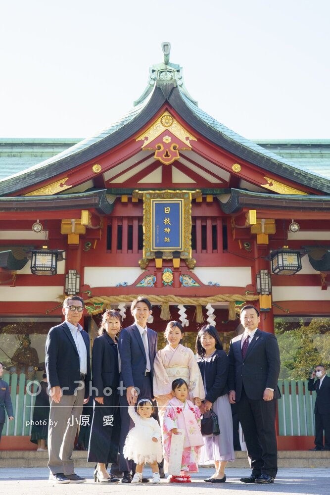 2人の子どもと両家祖父母を含む8人で撮影していただきました。当日は神社が混雑していたのですが、その中でも様々な場所でたくさん写真を撮っていただきました。家族全員、素敵な写真を見ることができてとても喜んでいます。