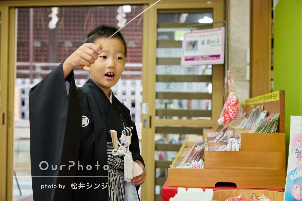 スタジオでも撮影予定があり、かしこまった写真よりも七五三詣の一連の流れの記録として撮っていただきたかったので、同じポーズで何回も撮られ(事前説明済。もちろん少しでも良い表情を撮るためにだとは思いますが)子どももどんどん不機嫌になり、何度か「次男はカメラ目線でなくてもポーズをしてるだけで充分ですから」と説明もさせていただきましたが、カメラ目線にするための道具(人形や音の鳴るもの)などなかったので、小さい子どもたちの目線を集めるまで撮るというのは大変でした。
