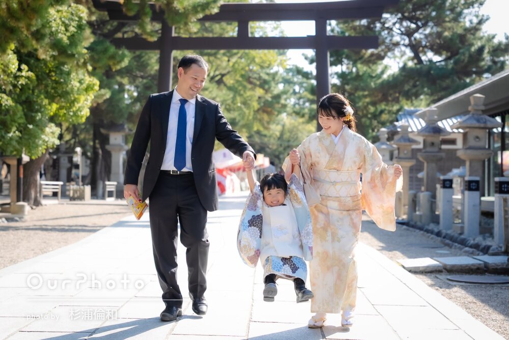 普段は自分で撮る事が多いので、写真を撮る事に気を削がれず親子3人ずっと喋りながら七五三詣りをできたこと、その様子を綺麗なお写真に仕上げていただき大満足の1日になりました。