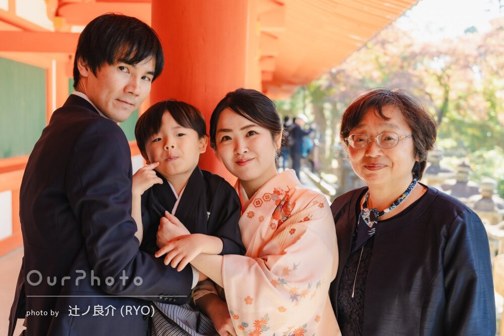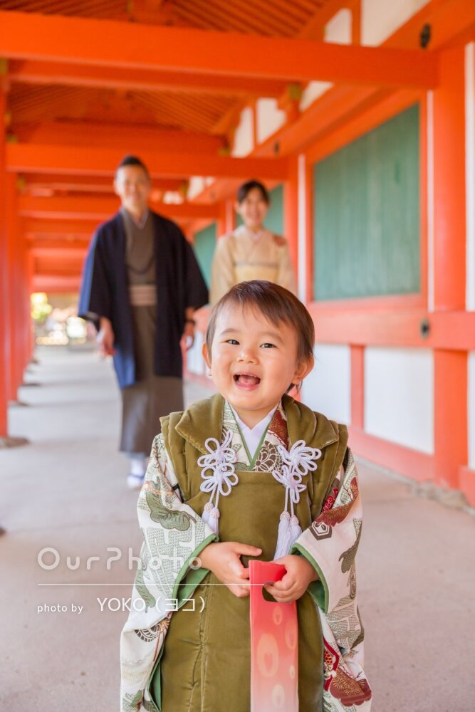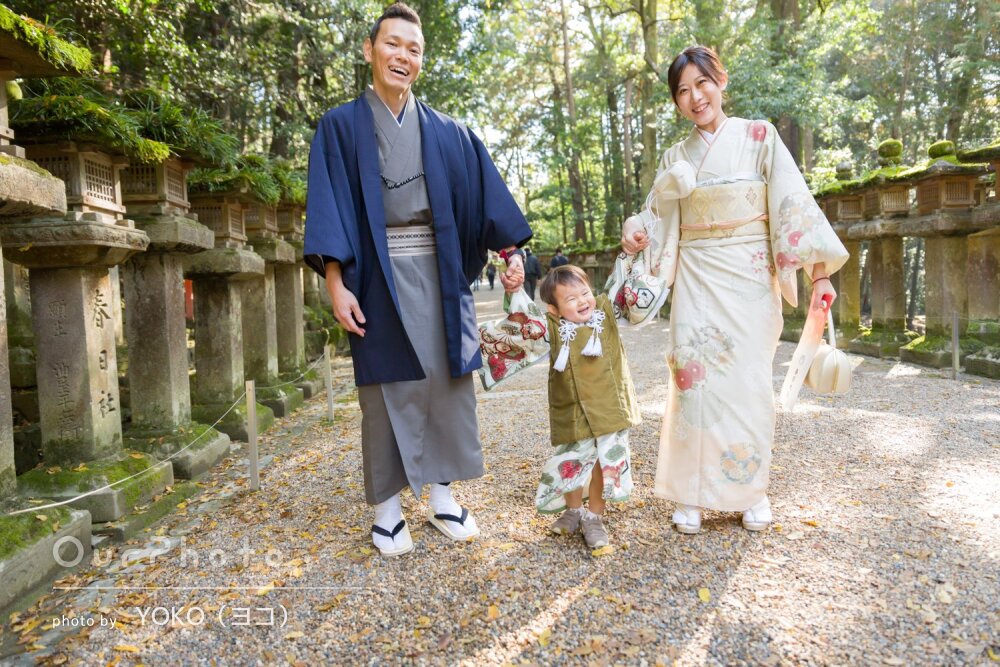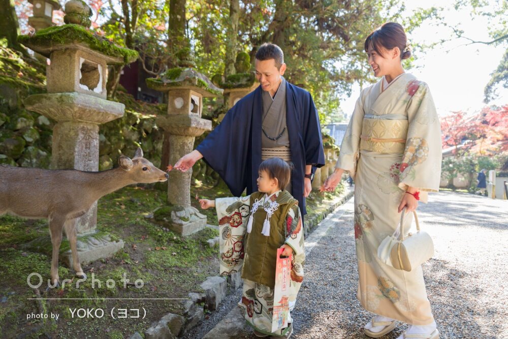 流行りのふんわり煌びやかな加工が苦手で、目に映ったままの自然な色合いで綺麗に撮って下さる印象のヨコさんにお願いして、春日大社にて、七五三の撮影をしていただきました。