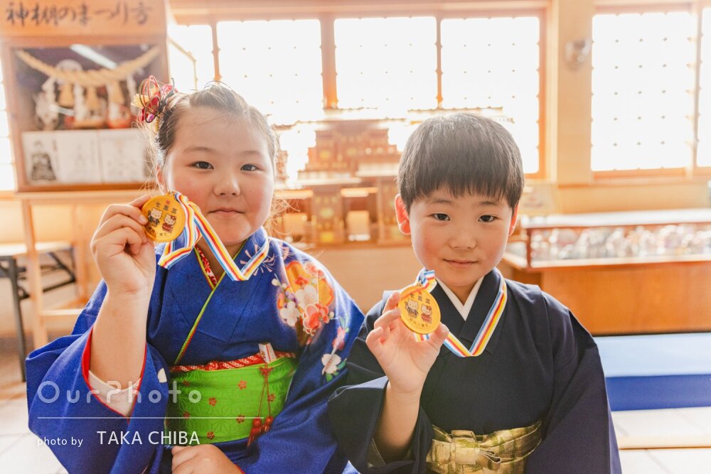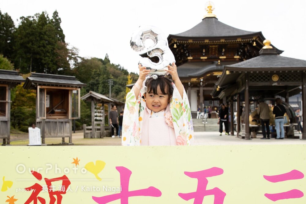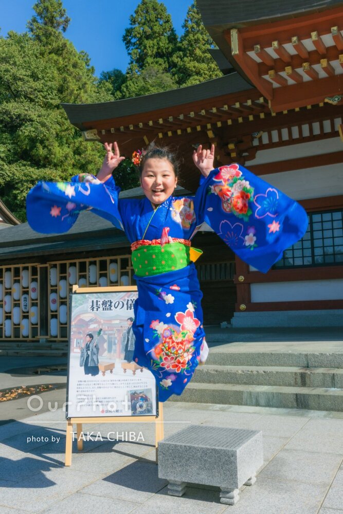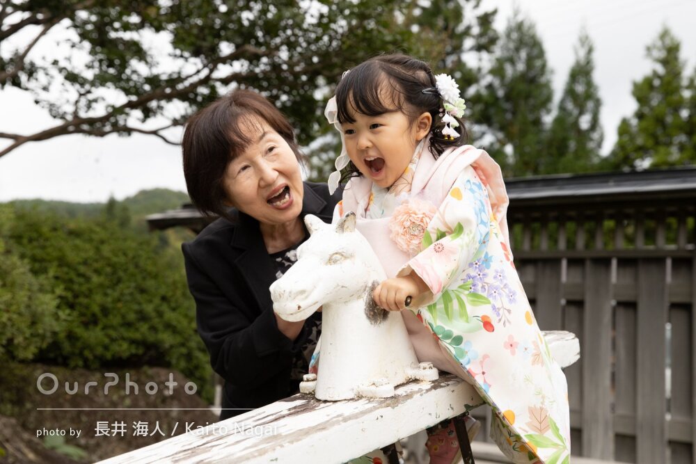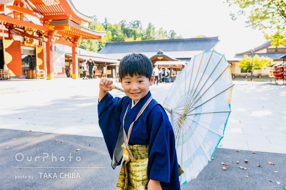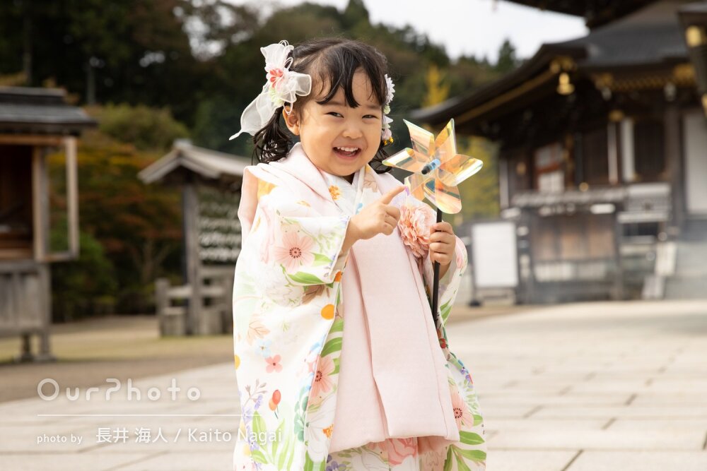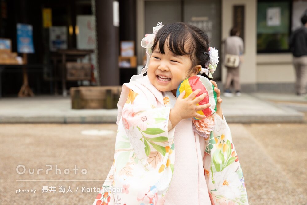 当日は、着物がきつくてご機嫌斜めな状態で神社に到着したのですが、到着後すぐにみーさんと会い、みーさんの声掛けで途端に元気にポーズを取り出しました。いろいろな小道具を使ってもらったり、終始ポジティブな声掛けで子供の気持ちをつかんでくださいました。