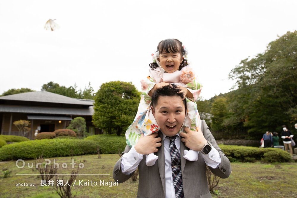 3歳になる娘の七五三で利用させていただきました。始めての七五三、初めてのロケーション撮影に加え、少し人見知りがちな娘のご機嫌など不安なことばかりでしたが、想像以上にとても良い日になりました。普段初めての人に会うと私の後ろに隠れてしまう娘が終始ニコニコでおふざけ顔まで披露するほど楽しめていたことも良かったです。小物を使った写真が欲しくていくつか持ち込みしたところ全て上手に収めていただけました。納品された写真は補正し過ぎず自然に仕上げてくださり、ベストショットを決められないくらいどれも素敵でした。数日経った今でも「長井さんに依頼して良かったね」「良い1日だったね」と家族で話しています。7歳の七五三でも是非またお願いしたいと考えています。この度はありがとうございました。