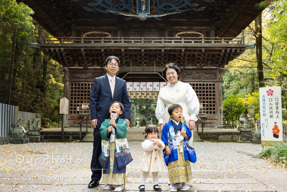 地元ではないので撮影するのにおすすめの神社を教えていただき、そこで撮っていただきました!撮影するのにとてもよいロケーションの神社で、ご祈祷は撮影の後に予定していたのですが先にご祈祷をさせてもらい、お参りしている様子なども撮っていただきました。