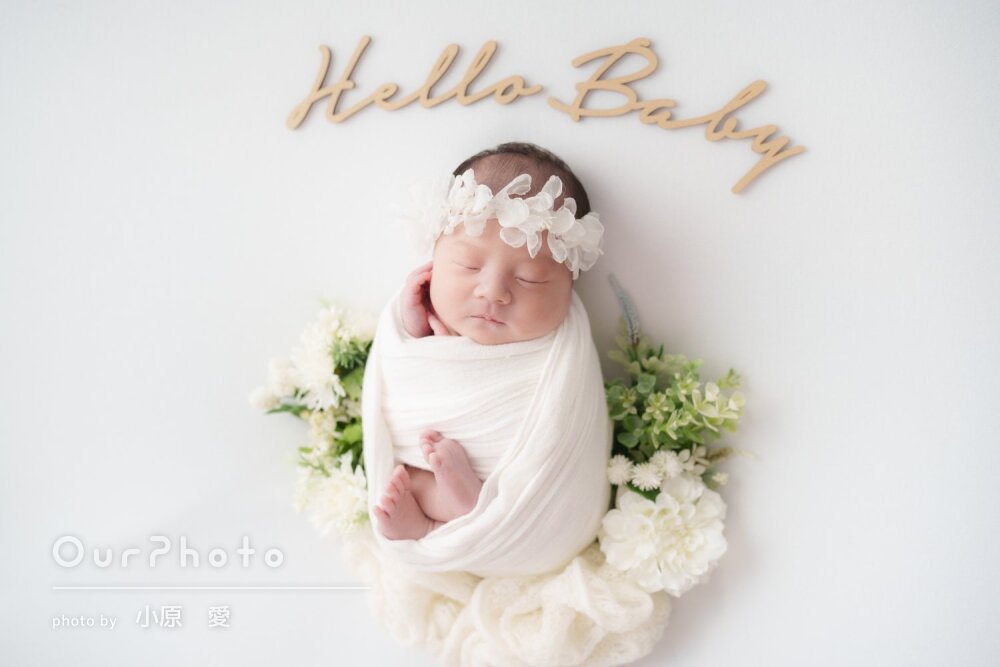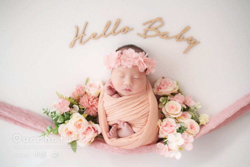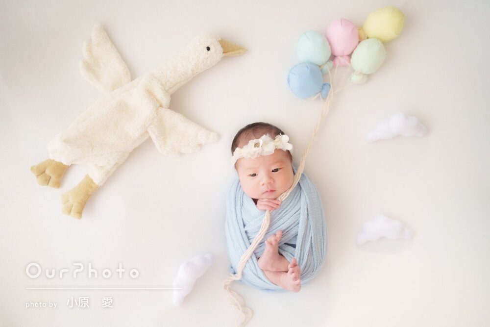 覚醒していた赤ちゃんをあやすのも上手で、可愛い小物をたくさん用意してくださり時間いっぱい写真を撮っていただきました。