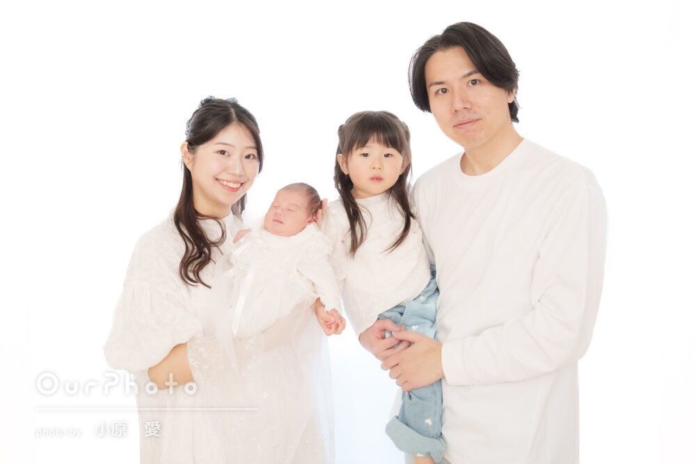 直前のお願いでしたがとても素敵なお写真を撮っていただきありがとうございました。生後3週間で退院したため対応してくださるフォトグラファーさんが少なく、撮影も難しいかなと不安でしたが、一度も起きることなくスムーズに終わりました。色々なソロショットに加えて姉妹写真、家族写真も対応いただきありがとうございました。納品も早く、写真もかわいくてとても満足です。