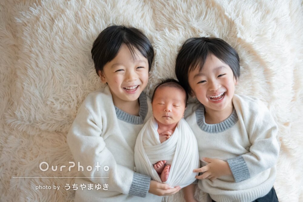 新生児と3歳長男の写真をお願いしました。最初は2コマを勧められましたが、人見知りの激しい長男なので長時間の撮影は厳しいかなと思い、1コマでお願いしました。