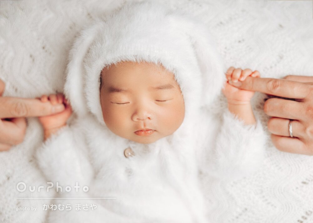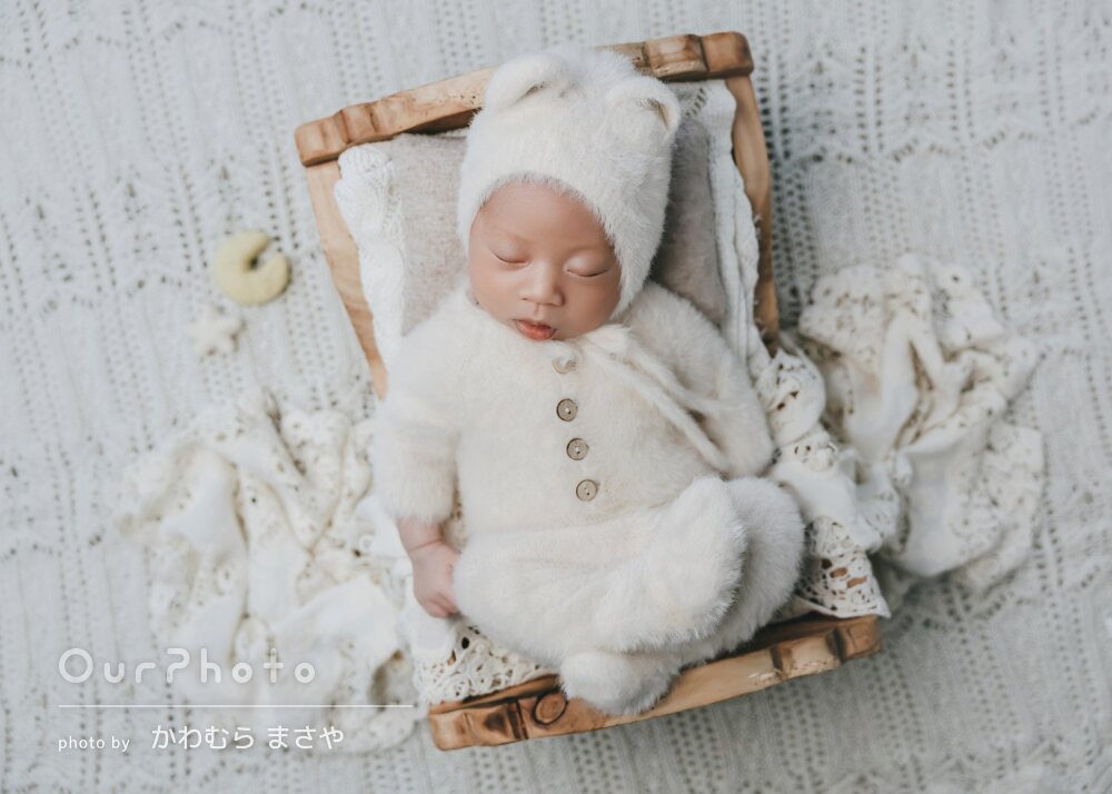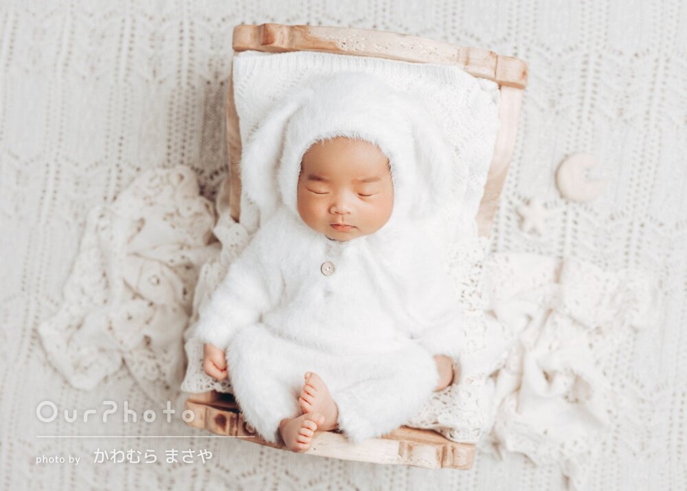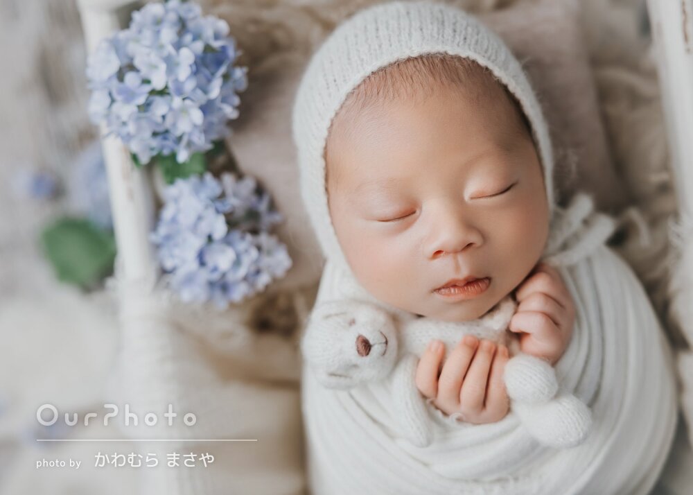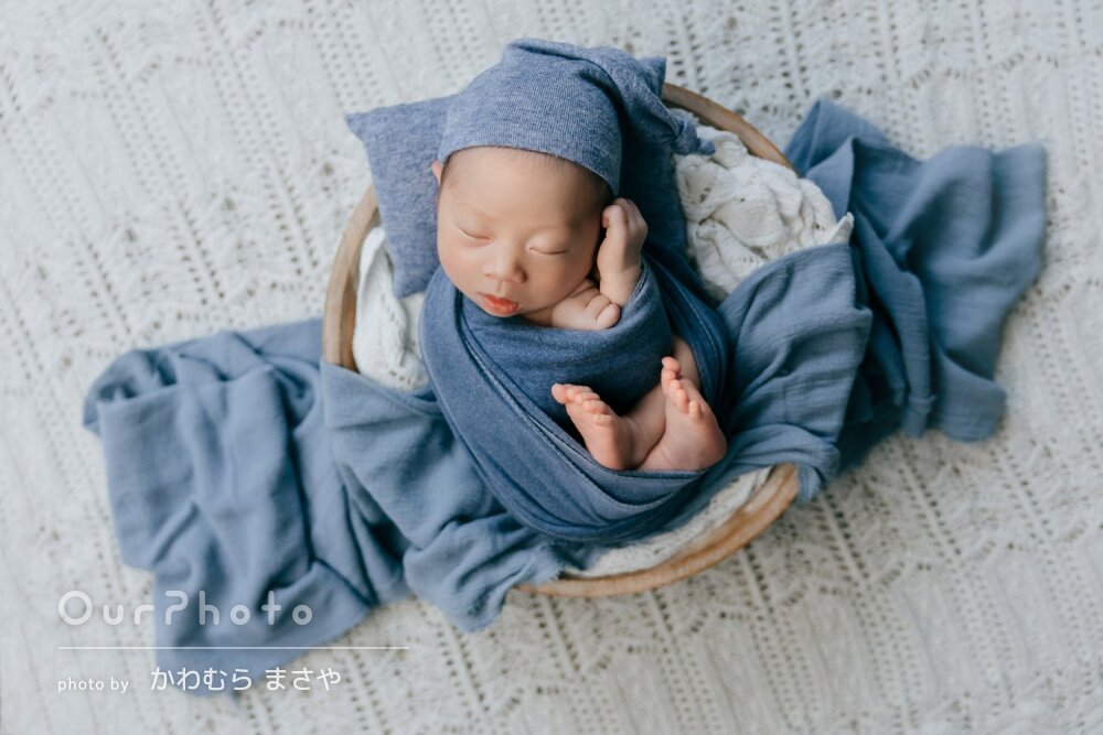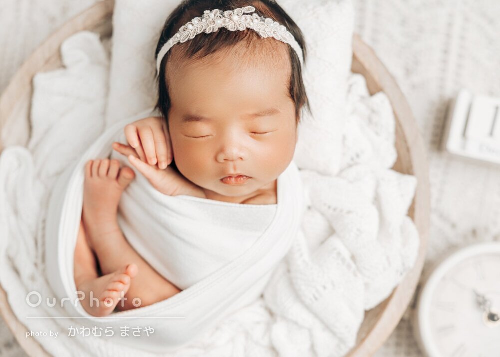 うちの子はふっくらしすぎていて、ニューボーンフォトらしい写真を撮れるのかな?と不安でしたが、あらいさんのテキパキとした撮影で一度も起きることなく、ニューボーンフォトらしいおくるみで丸まった写真や今しか取れないかわいい姿を撮ることができました!