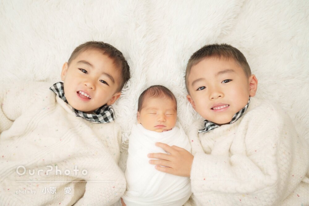 新生児と3歳長男の写真をお願いしました。最初は2コマを勧められましたが、人見知りの激しい長男なので長時間の撮影は厳しいかなと思い、1コマでお願いしました。