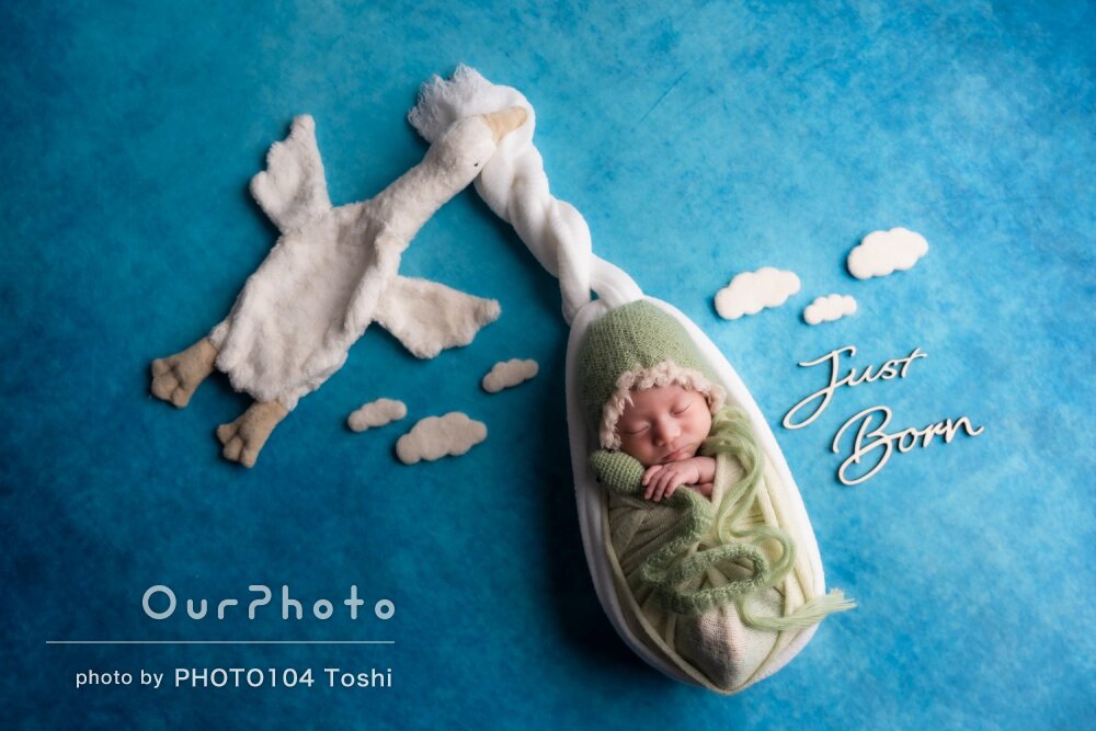 今回は見た時に一目惚れした『コウノトリshot』を撮りたい!という気持ちでお願いしました(^^)コウノトリshotはベビが深い眠りについてないと難しいみたいと聞いていたので、当日のベビの機嫌次第で撮れるか分からなかったですが、ぐずった時も根気よくあやしてくれたり、泣き止ませて落ち着かせてくれたおかげで希望通りの写真を撮っていただきました✨