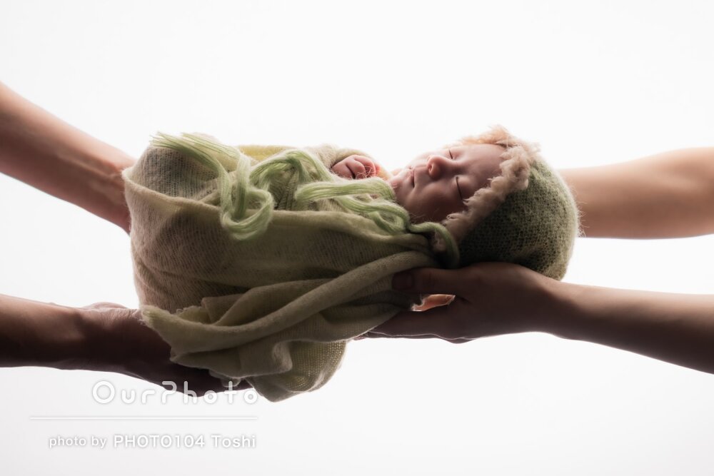 魔の3週間を迎え抱っこじゃないと大泣きしてしまう我が子でも、可愛く色々なパターンで写真に残していただけました。