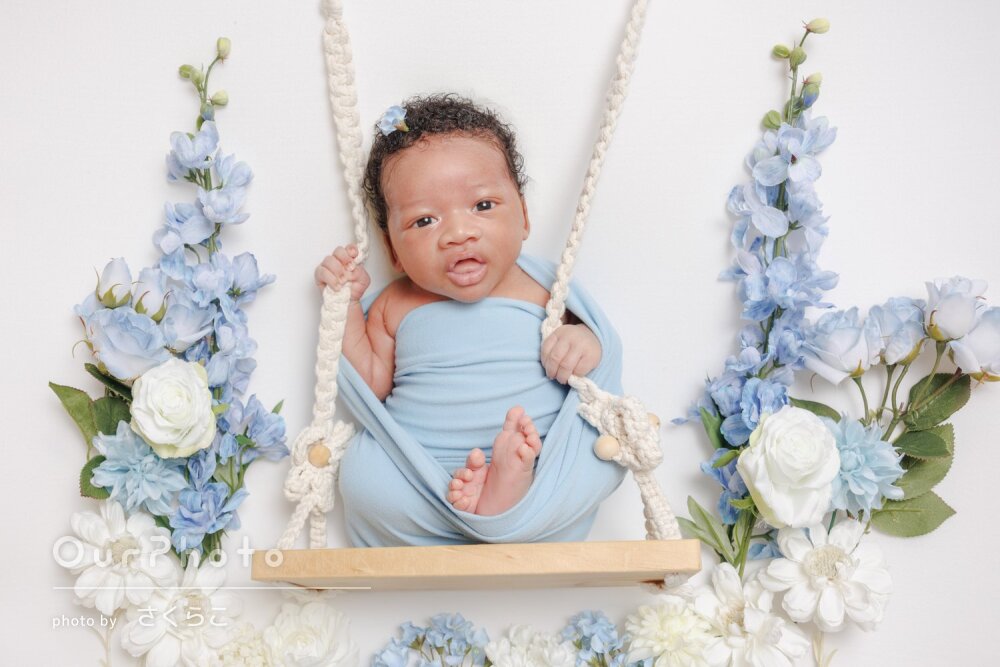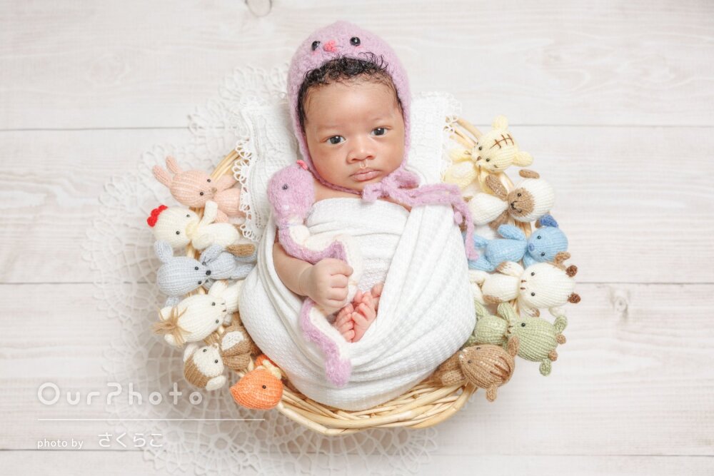 内容が豊富でとても満足のいく撮影でした。おくるみの色を迷っていたらこっちは白で撮って後から変えてみましょうかと提案してくださったり、小物もたくさんありお人形さんを入れて撮ってくれてて嬉しかったです!事前に出した希望のショット(ハンモック風や足をハートの手で囲むやつなど)も叶えてくださいました。可愛い写真を撮っていただきありがとうございました。ただ、好きなおくるみの色でハンモック全体の写真が納品されず残念でした。