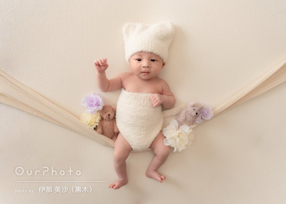 初めてニューボーンフォトをお願いしたのですが、かわいいセットでたくさんお写真撮っていただき感動でした♪
