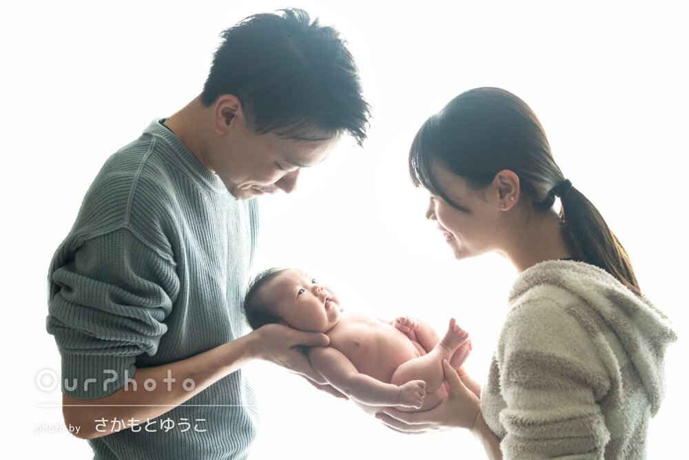 限られた時間の中でいろんなパターンの写真をたくさん撮影していただきました。赤ちゃんが泣いている時のあやし方なども教えて頂き、とても勉強になりました。すごく良い思い出になりました。