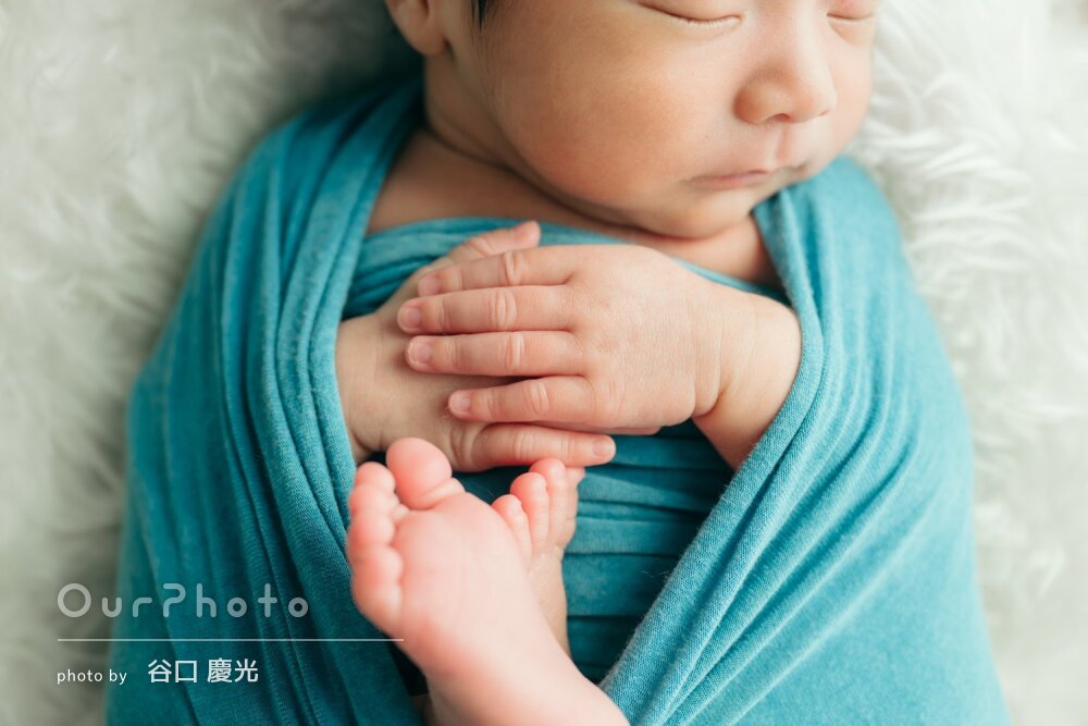 撮影直前までギャン泣きでコウノトリショットを撮影できるのかかなり不安でしたが谷口さんに寝かしつけのご協力いただけたので撮影することができました。おくるみの巻き方等助産師さんの指導を受けているとのことで無理な体勢は取らせないので新生児に負担のかかりにくい撮影ができて良かったです。