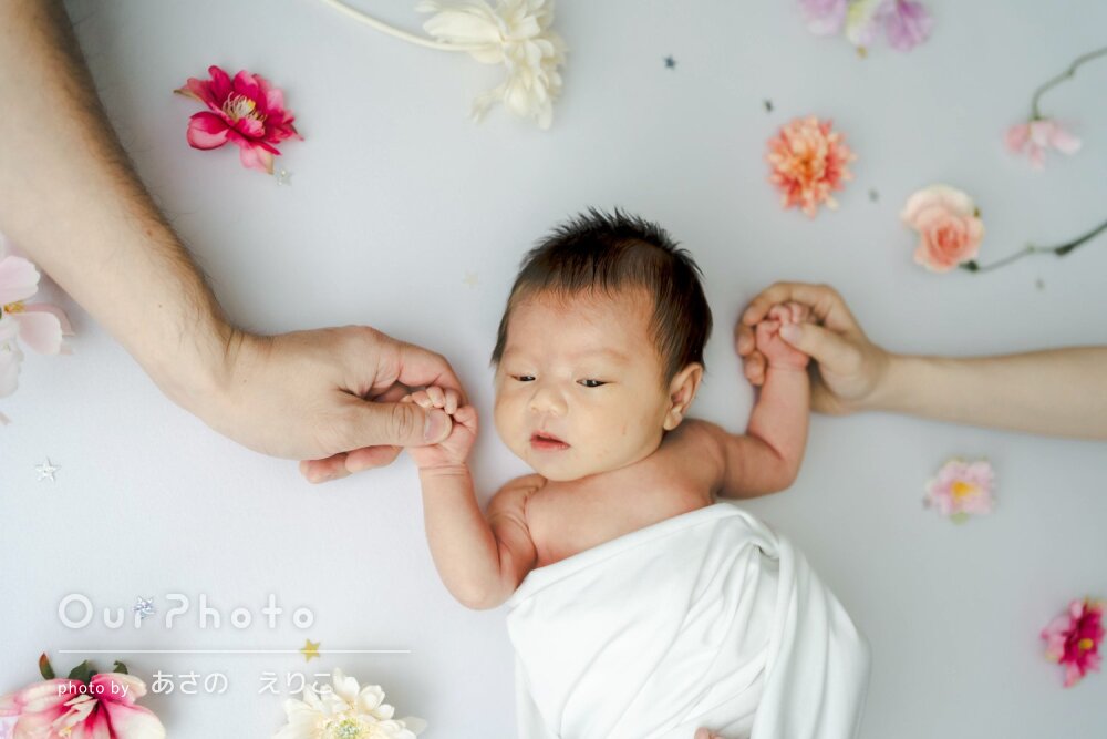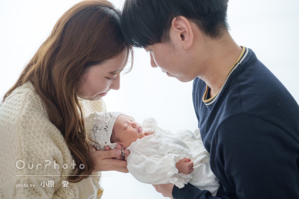 新生児との撮影ということで、色々と不安が大きかったのですが、赤ちゃんに合わせて柔軟に対応して頂き、撮影したいシチュエーションを全て撮り終えることができました。