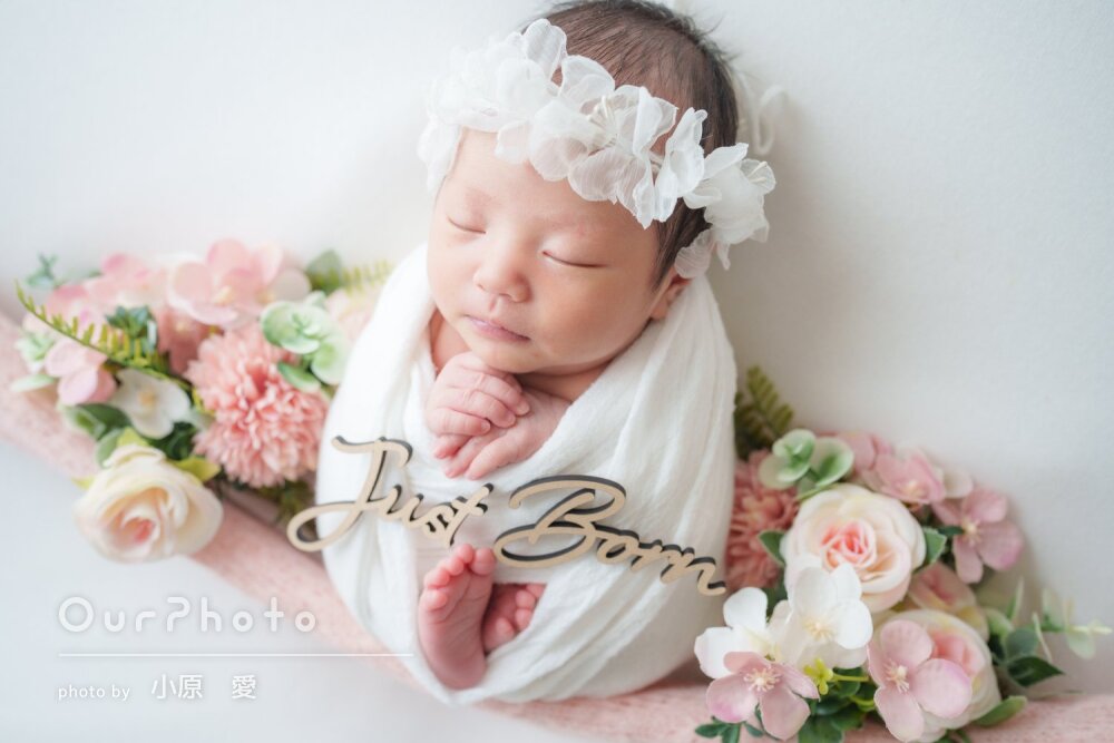 当日は1時間の枠でしたが、テキパキと背景のシート(布?)や反射板?を設置し、赤ちゃんをおくるみで包んで、素敵な写真をたくさん撮ってくださいました。