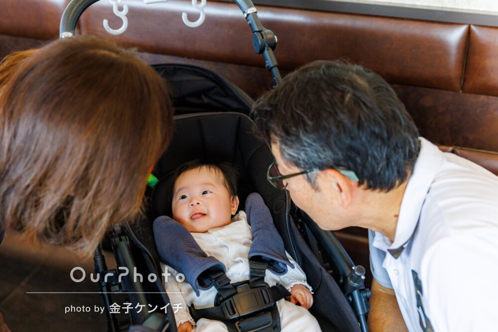 飲食店で行ったのですが、「近くに川があるのでお散歩の様子も撮りませんか」とご提案いただき、とても素敵な写真を撮っていただきました。ベビーカーを押している家族皆の写真、普段撮れないのでとても嬉しかったです。