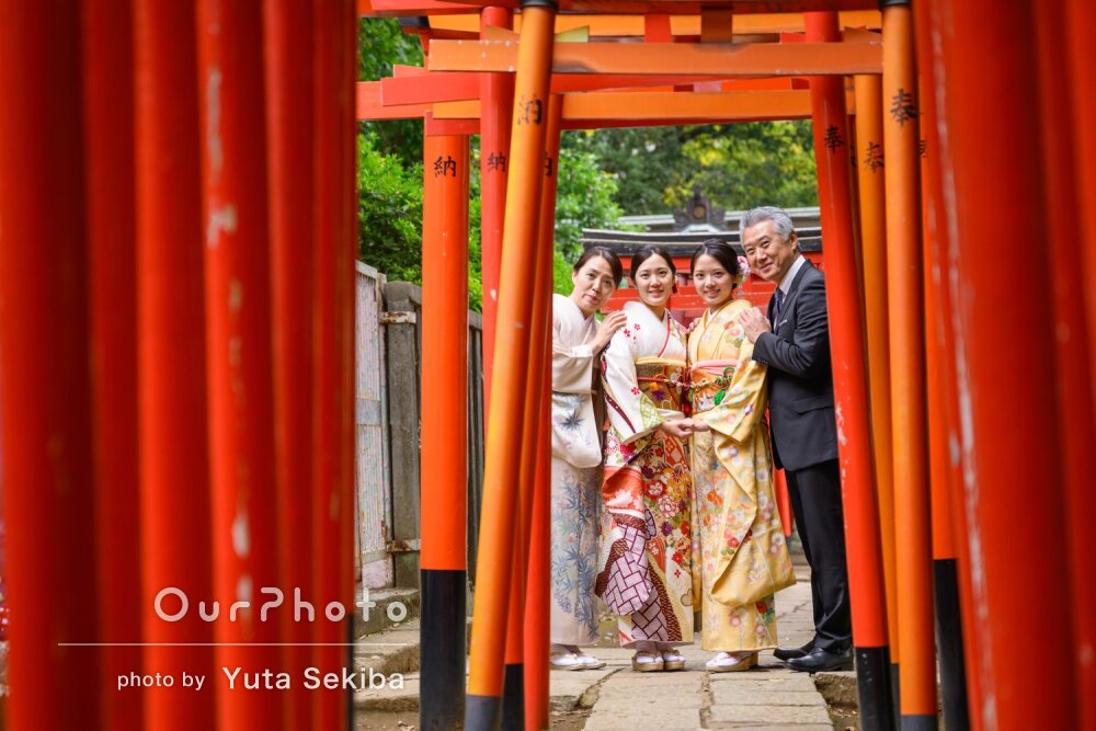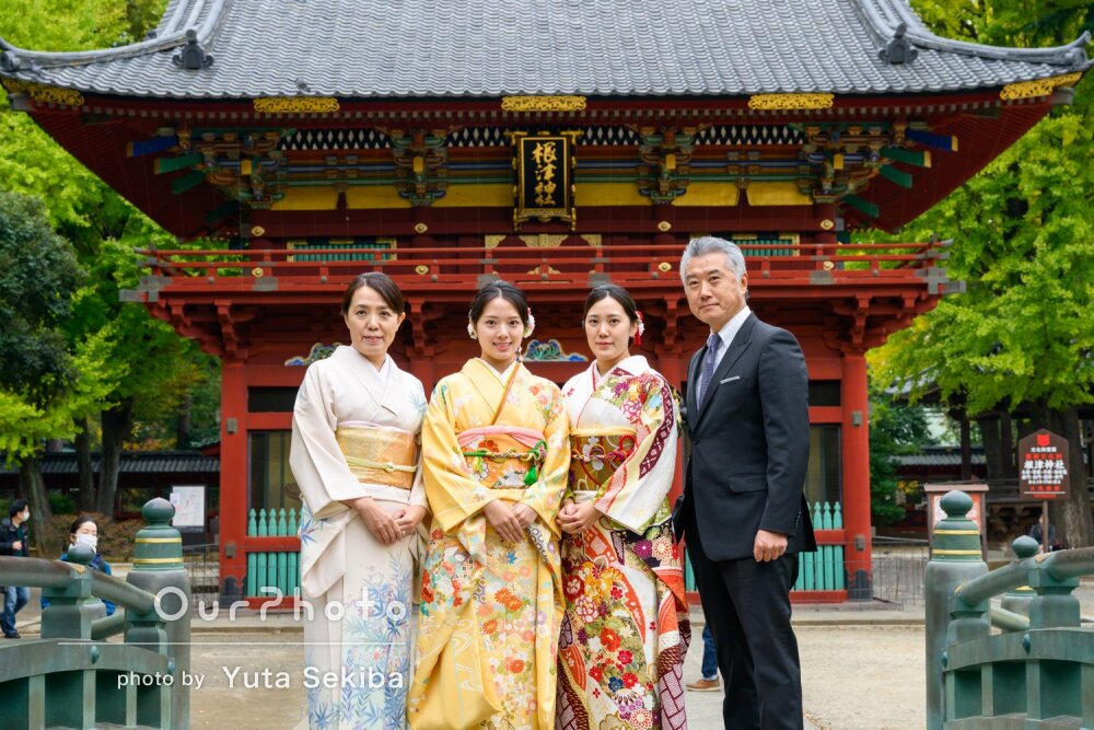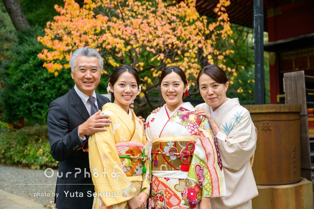 早々に納品していただき有難うございました。成人式の前撮りでしたが、根津神社の中でも撮影に良さそうな場所や構図を提案していただき、いろんな写真が撮れました。娘たちの振袖姿は可愛らしく、振袖らしいポーズもしっかり押さえていただき満足しています。特に家族写真はいい記念になりました。