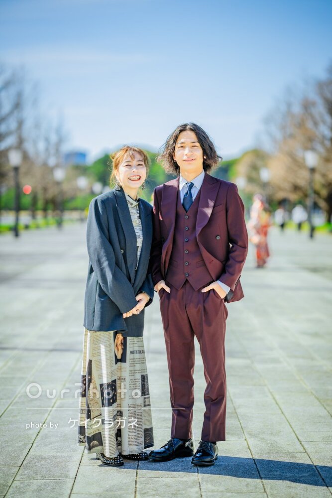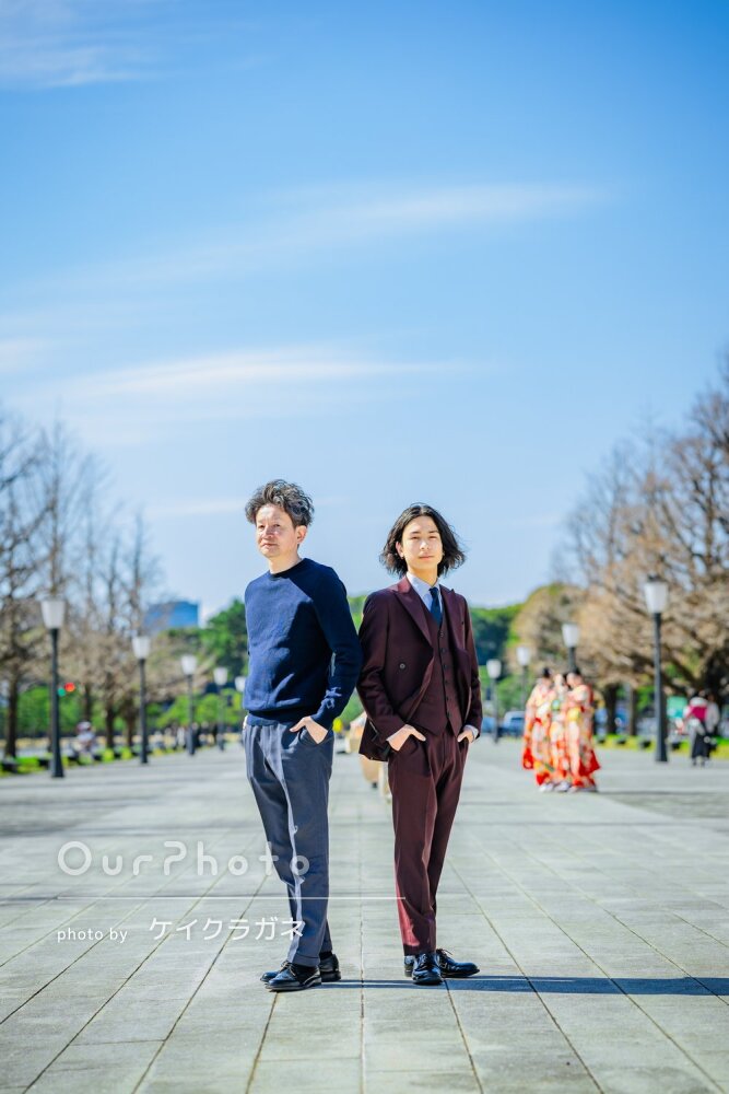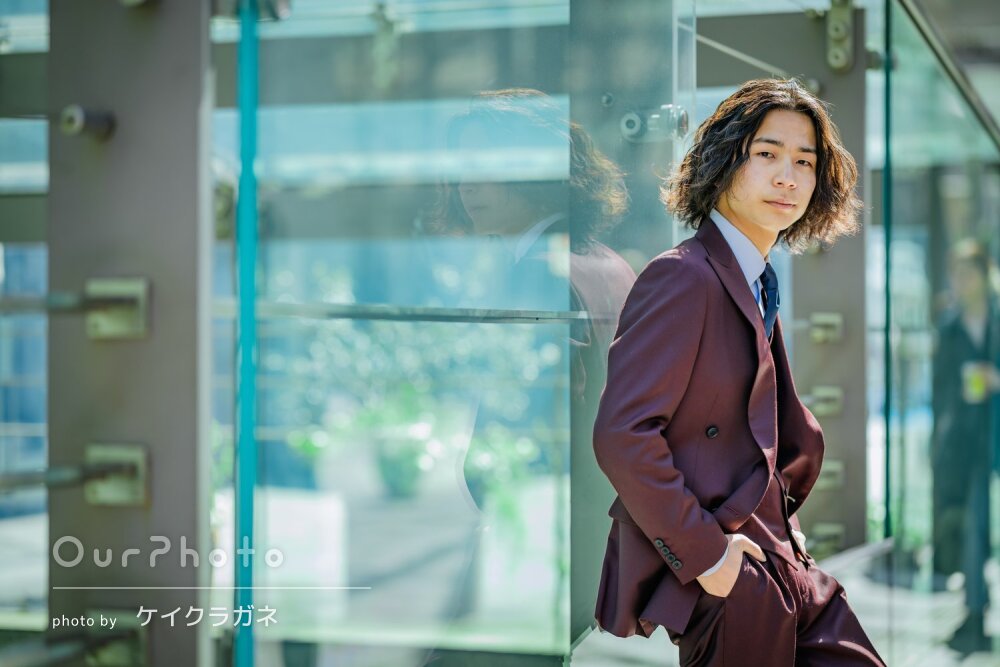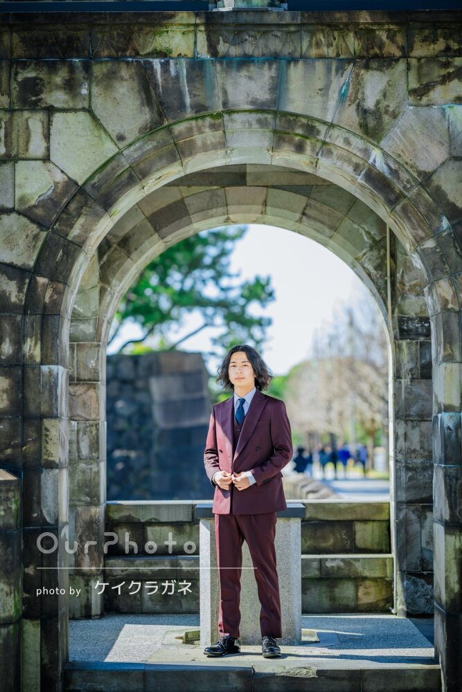 男の子の成人式の撮影は、OurPhotoの参考写真などでもあまり見かけないため少し不安がありました。どのような雰囲気の写真がいいのかも分からず、撮影場所も決まっていない状態でしたが、撮影場所を提案していただき、ポージングもその都度教えていただけたので安心して撮影に臨むことができました。