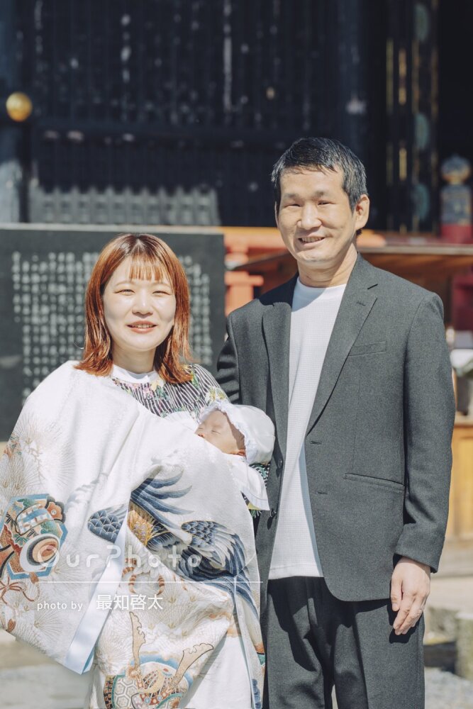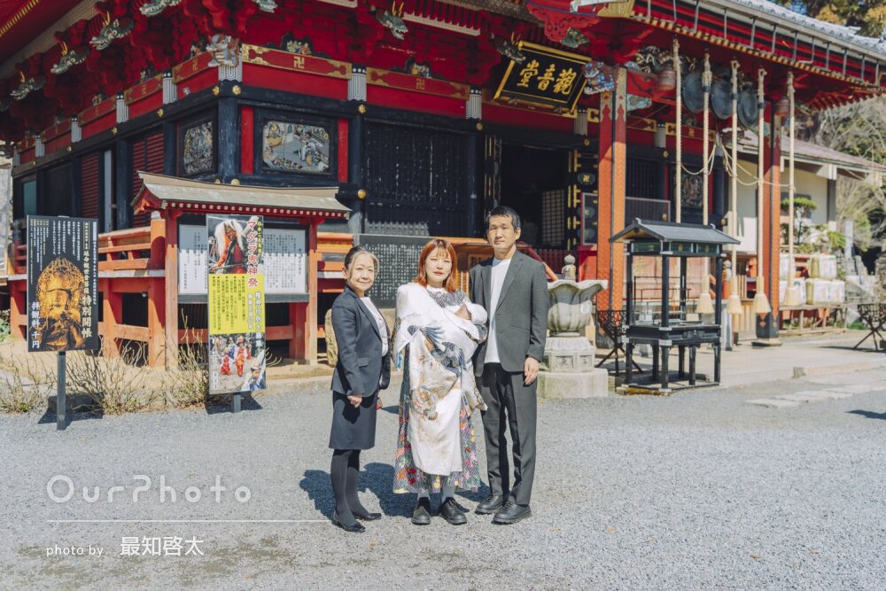 この度は素敵な写真を撮っていただきありがとうございました。ふざけがち、大笑いしがちな私たちを上手く切り取っていただいた自然なカットもありがたく、大変思い出に残るお宮参りとなりました。