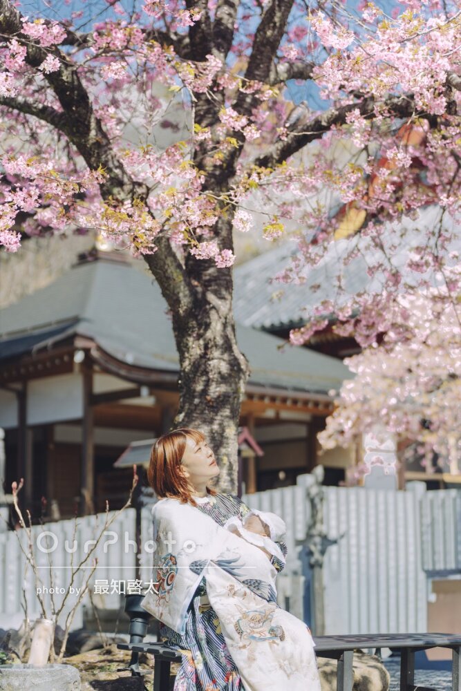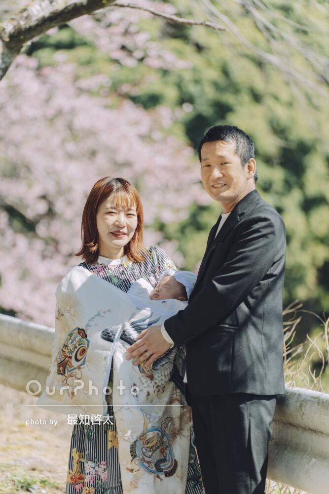 こだわって選んだ産着が桜の景色に美しく映えていて、プロの方にお願いして本当に良かったと感動しています。