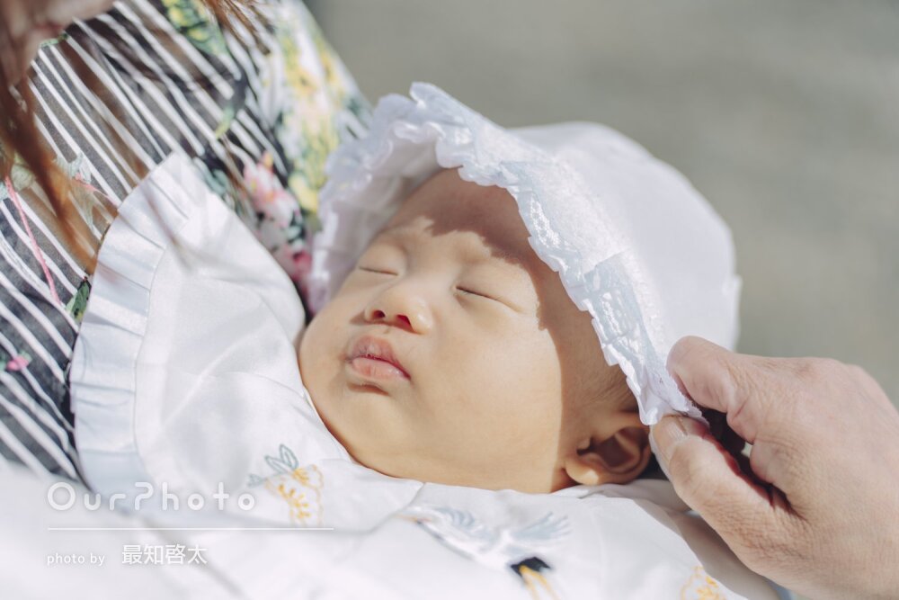 お宮参りの撮影でお世話になりました。1週間前の依頼でしたが対応いただき大変助かりました。撮影当日もとても暑い中、両親や子供へお気遣い、水分補給の確認や表情が堅かった両親への声掛けで緊張がほぐれて全員の笑顔の写真に大満足です。自然な表情も気付かぬうちに写真に納めていただきお気に入りの写真が何枚もできました。ポージングの指示も分かりやすく写真が苦手な主人もすごく良い表情が見られてすごく嬉しかったです。子供は終始眠りについていましたが、その中でもベストショットたくさん撮っていただき大満足です。