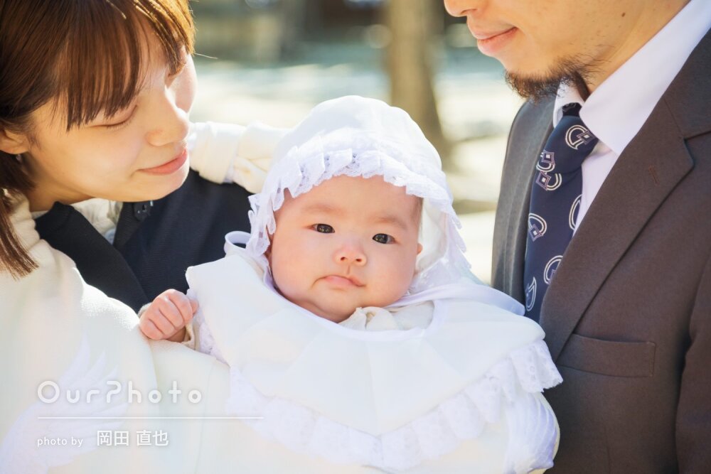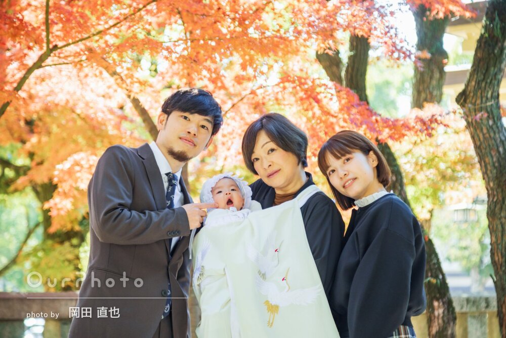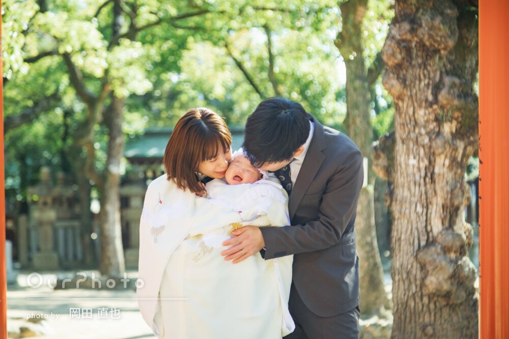 ご祈祷の様子や集合写真、色々なパターンで撮影していただきました。途中、赤ちゃんの機嫌が悪くてミルクをあげたりして時間が延びてしまったのですが嫌な顔せず最後まで撮影してくださりました。