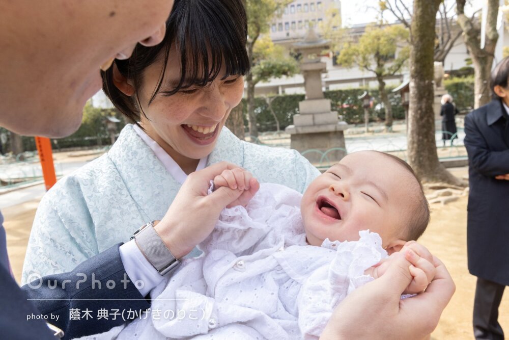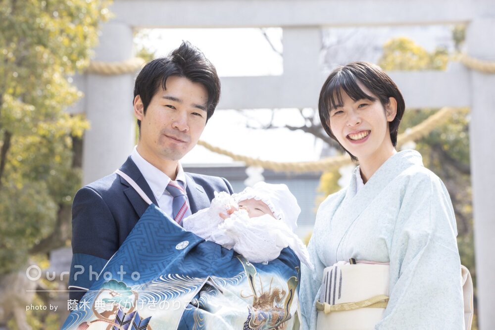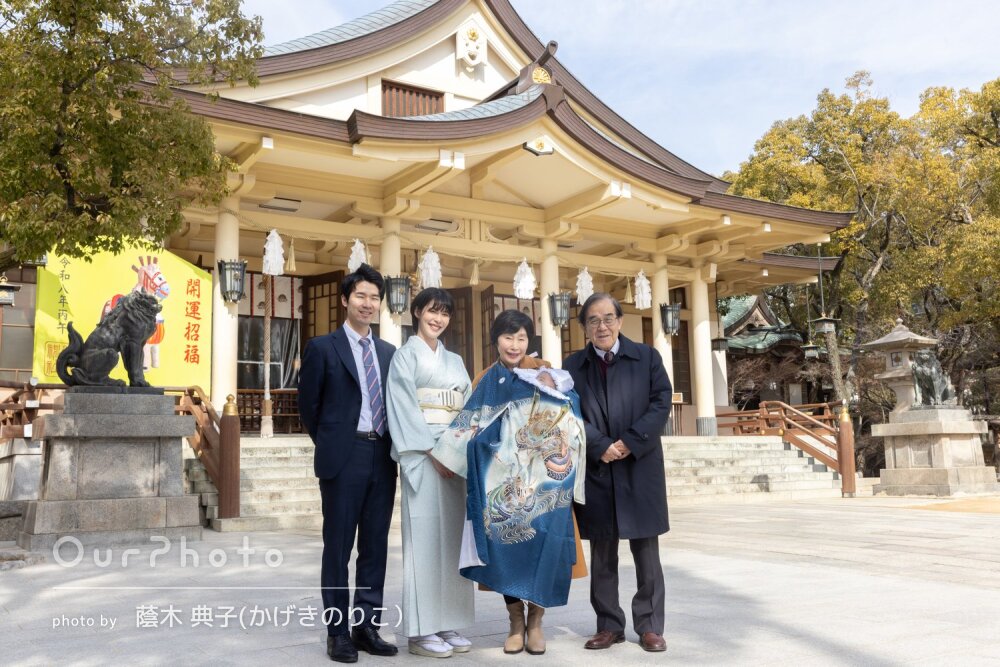 当日は産着の着付けもしていただき、とても助かりました。また、神社での流れや立ち位置などもその都度エスコートしてくださり、慣れない中でも安心して撮影に臨むことができました。初めて会う方に写真を撮られることや、写真に慣れていない家族(特に祖父母)がうまく写れるかなど不安もありましたが、田上様の温かいお人柄のおかげで、終始和やかで楽しい時間となりました。(汗を流しながら腰を低くして撮影してる姿に、母は虜になっていました笑)