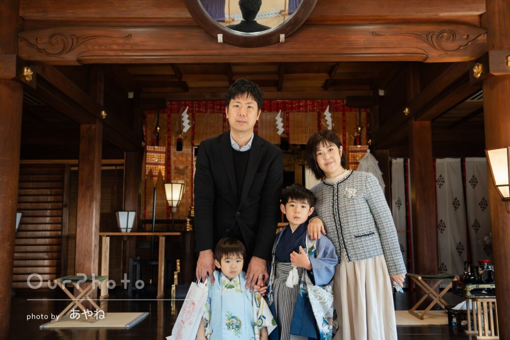 あやねさん、素敵な七五三のお写真をありがとうございました!前回撮っていただいた桜の自然な家族写真と、かわいいお人柄がすごく好きで今回も次男の七五三でお願いしました。お天気もよくお気に入りの神社での自然体でキラキラしていた子供達の写真を撮っていただき感謝です。子供達がやんちゃで私がハラハラしていたのにもかかわらず、穏やかに子供達のペースにあわせて楽しませて撮影してくれました!おかげで自然なお写真がたくさんとれました!!光加減などもとても綺麗で感謝ですー。また何かの機会にはあやねさんにお願いしたいです!当日の時間の変更などもご提案くださり本当に助かりました