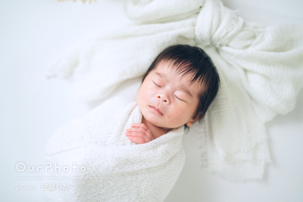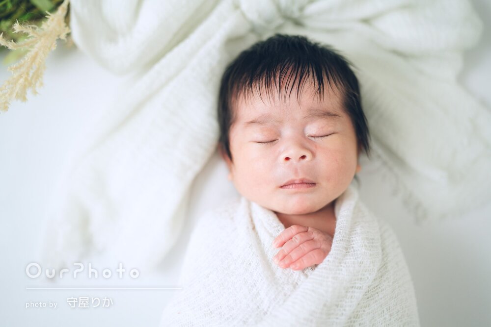 撮影中に子どもが泣いて中断したりおくるみから脱出してしまうことが何度もありましたが、根気強くあやしたりおくるみを巻き直してくださったおかげでかわいい写真が撮れました。