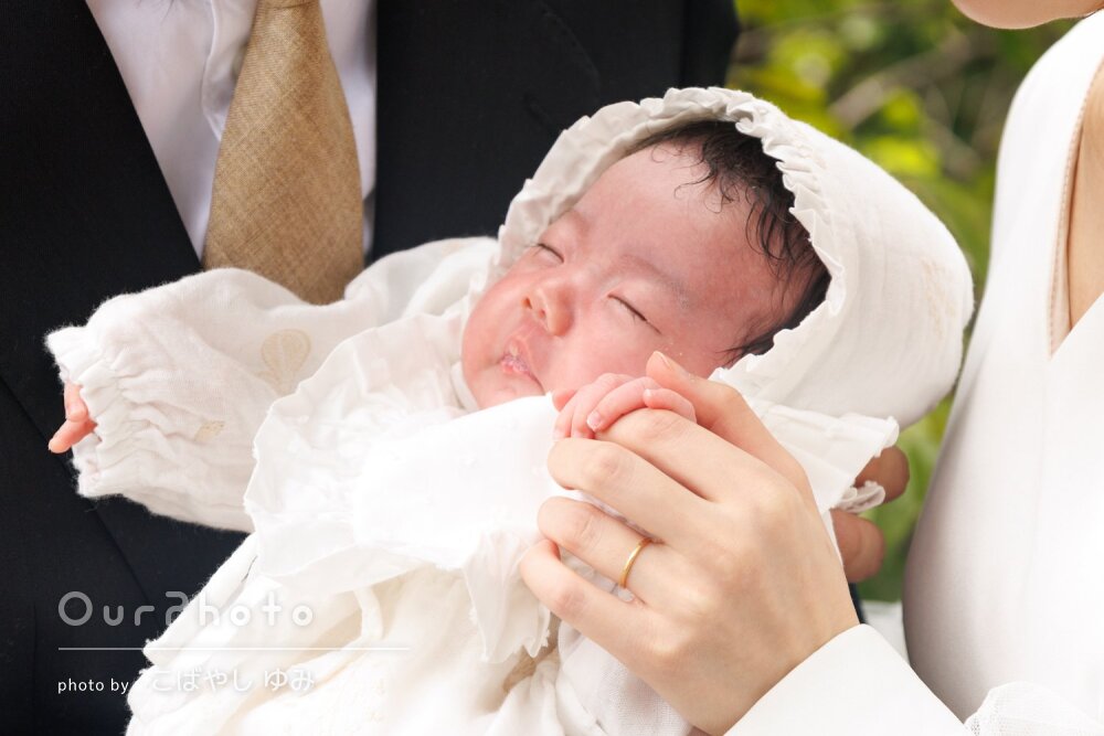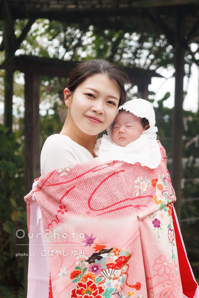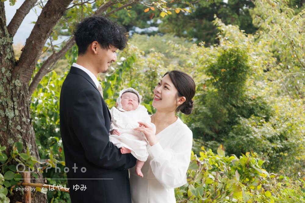 初めてOur Photoを利用しました。お宮参りで出産後初めて両家の両親が集まる機会に、スタジオでの堅い写真は嫌だな〜というのもあり今回お願いしてみました。写真撮影に慣れない私たち家族にも(また私にとっては初めて行く神社だったのですが)立ち位置・笑顔・撮影場所などどんどん誘導してくださり、大変ありがたかったです。子どもの事も一生懸命あやしてくださいました。当日は楽しい撮影になりましたし、出来上がった写真は本当にどれも素敵なものばかり。同じメンバーの写真でも引きのショット、背景がバランス良く写ってるショット、表情違いなどもたくさん撮ってくださいました。子どもの事もかわいく撮ってくださり感謝です。また当日は小雨がパラついていましたが、完成品は特に気にならず素敵な仕上がり。本当に外で撮って良かったですし、今回お願いして良かったです。夫や家族も喜んでいます。