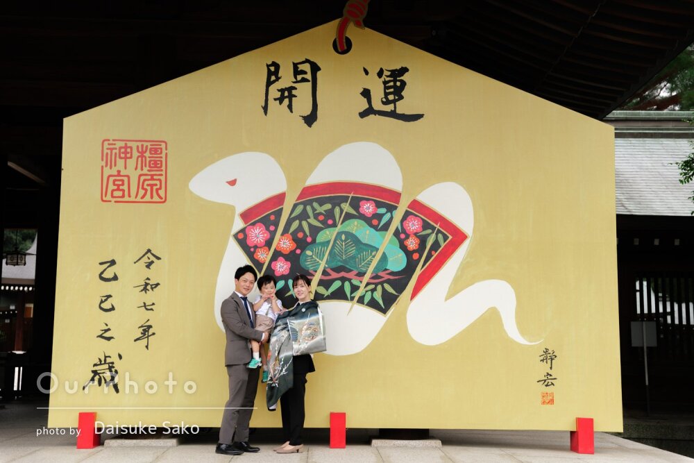 当日は、着物がきつくてご機嫌斜めな状態で神社に到着したのですが、到着後すぐにみーさんと会い、みーさんの声掛けで途端に元気にポーズを取り出しました。いろいろな小道具を使ってもらったり、終始ポジティブな声掛けで子供の気持ちをつかんでくださいました。